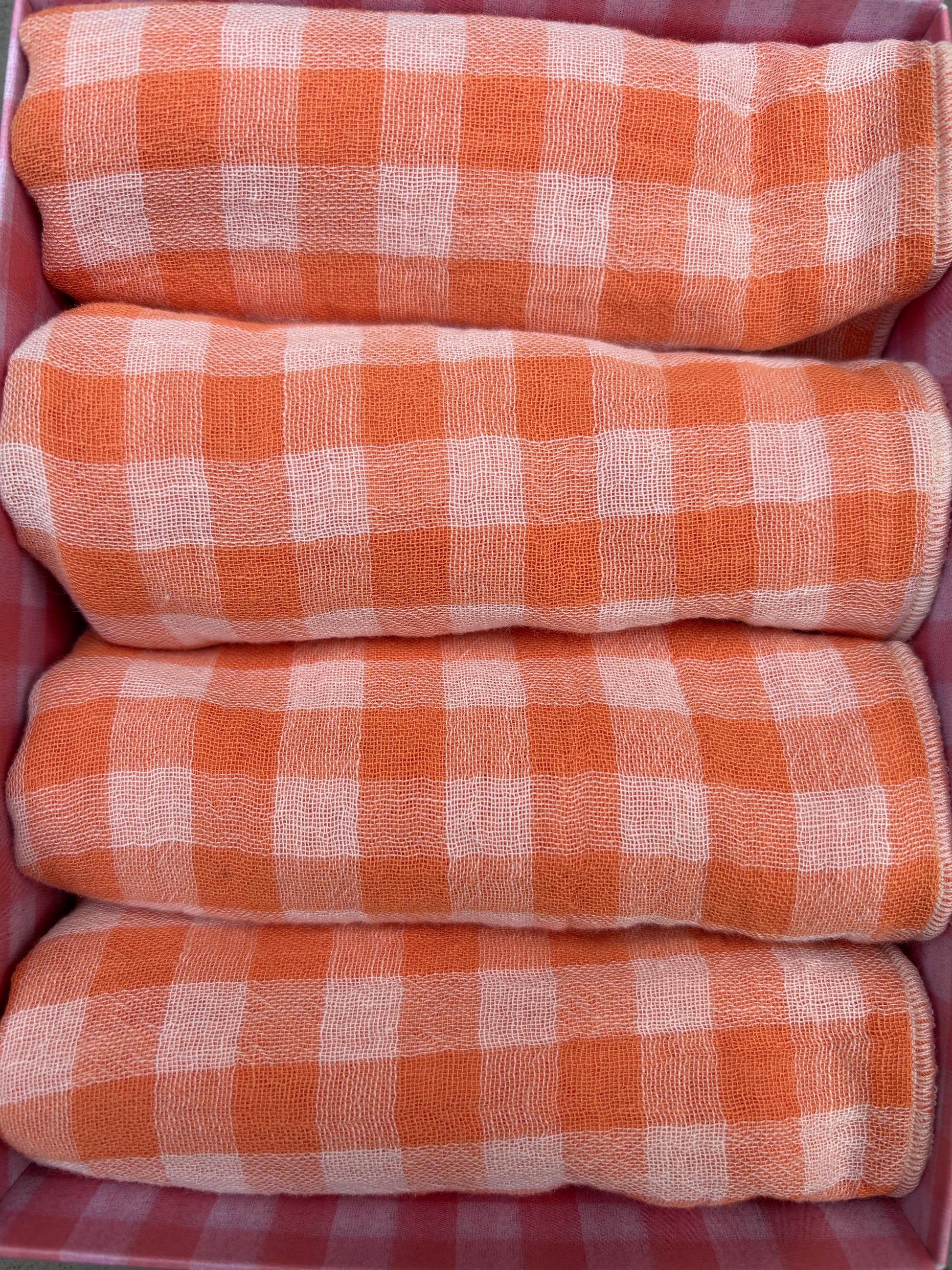 Set de 4 serviettes en double gaze de coton vichy clémentine. Format 40x40 cm, finition point bourdon ton sur ton. Douces, légères et faciles à vivre : lavables en machine à 30°C, séchage rapide, pas besoin de repasser.