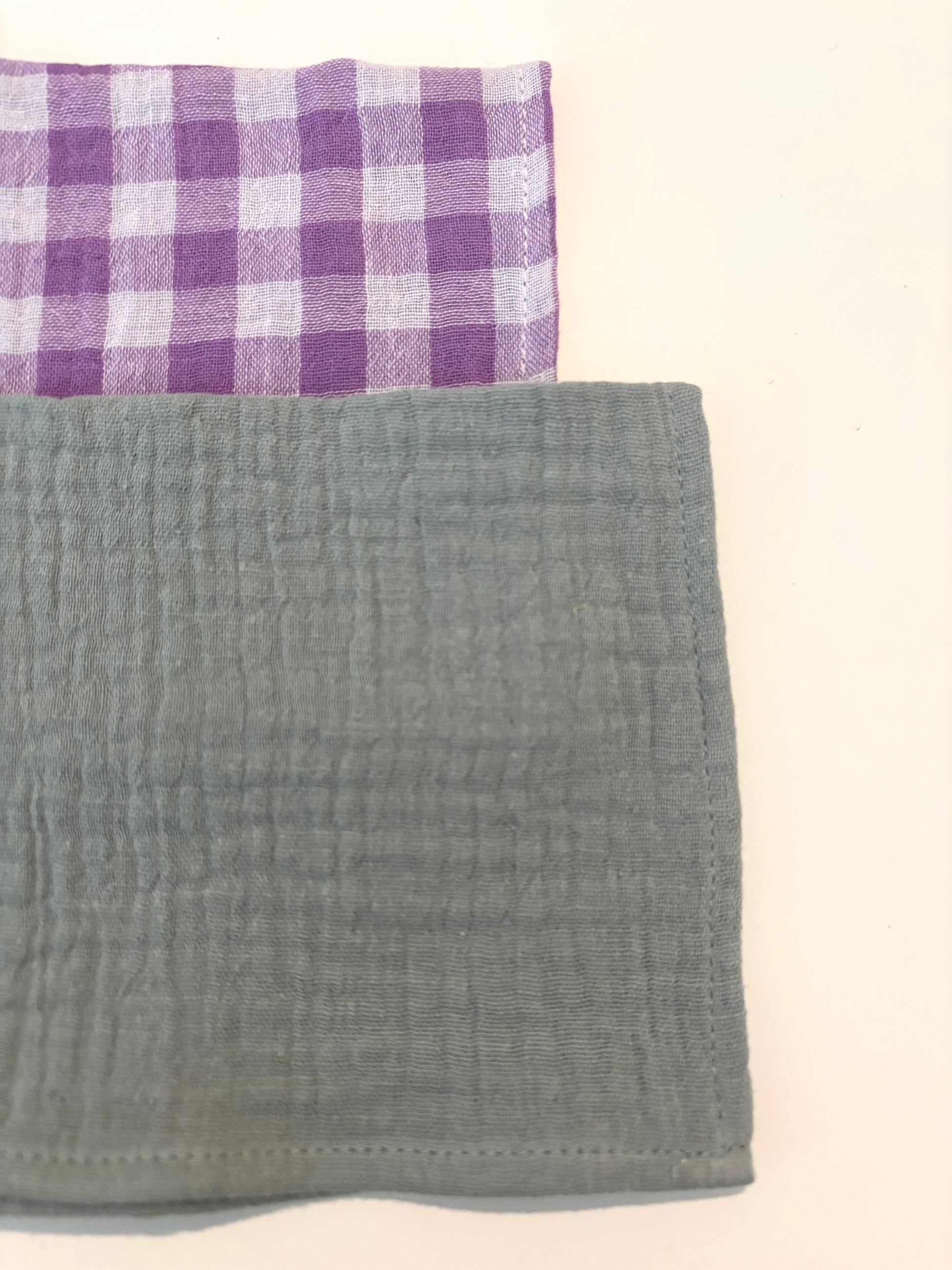 Coffret de 6 serviettes de table Petite 23x23 – Gaze de coton unie vert de gris et vichy violet