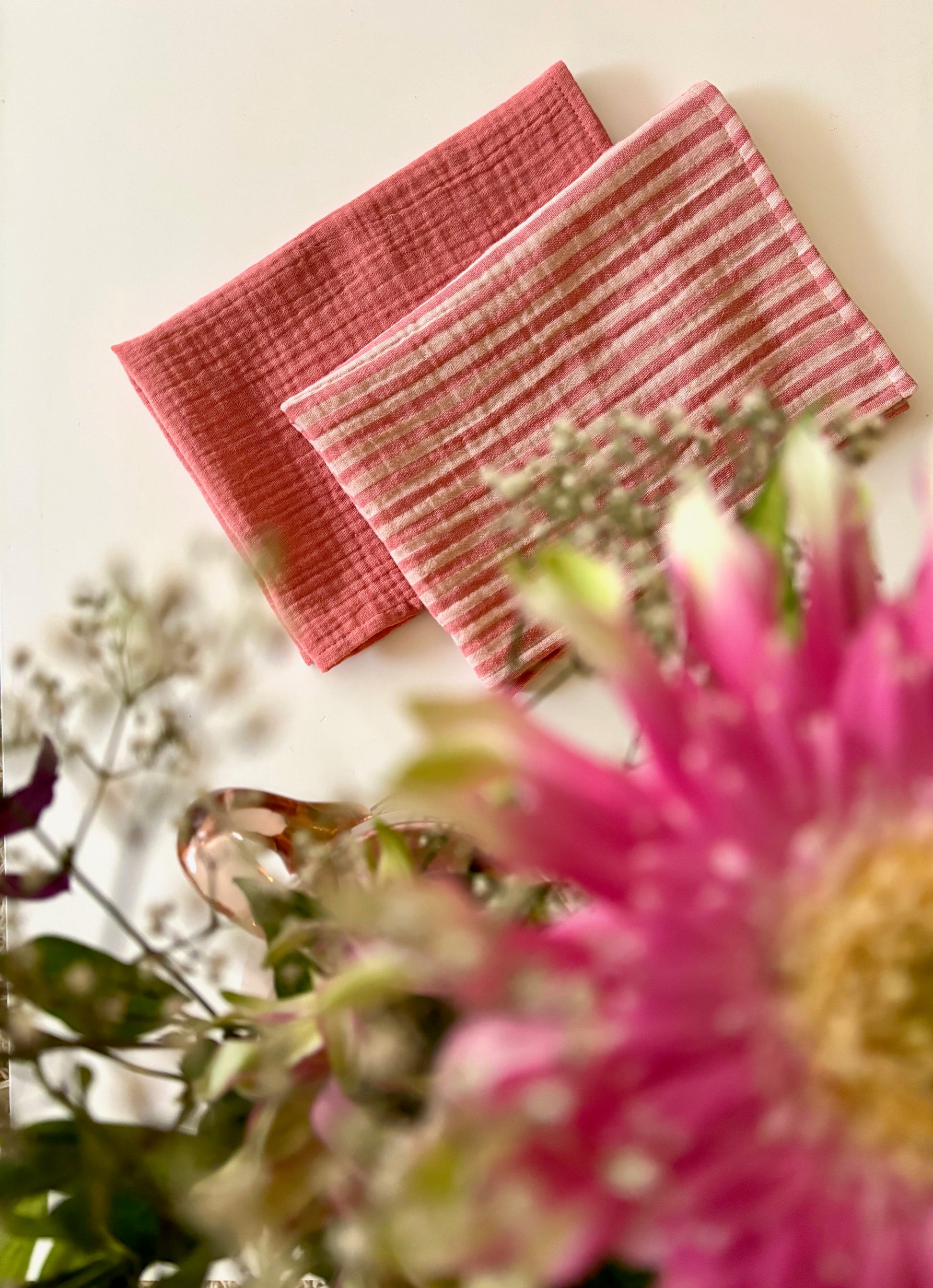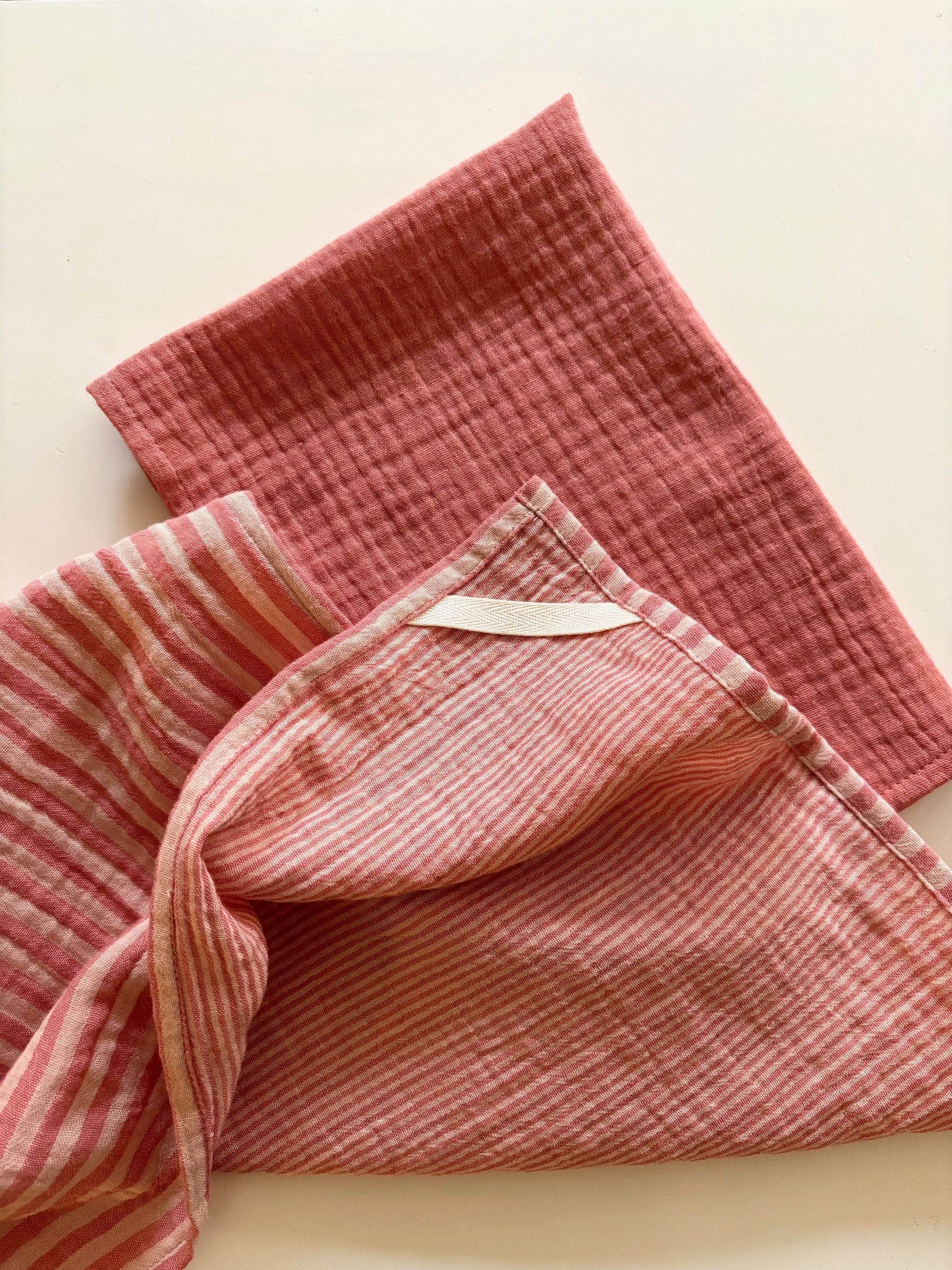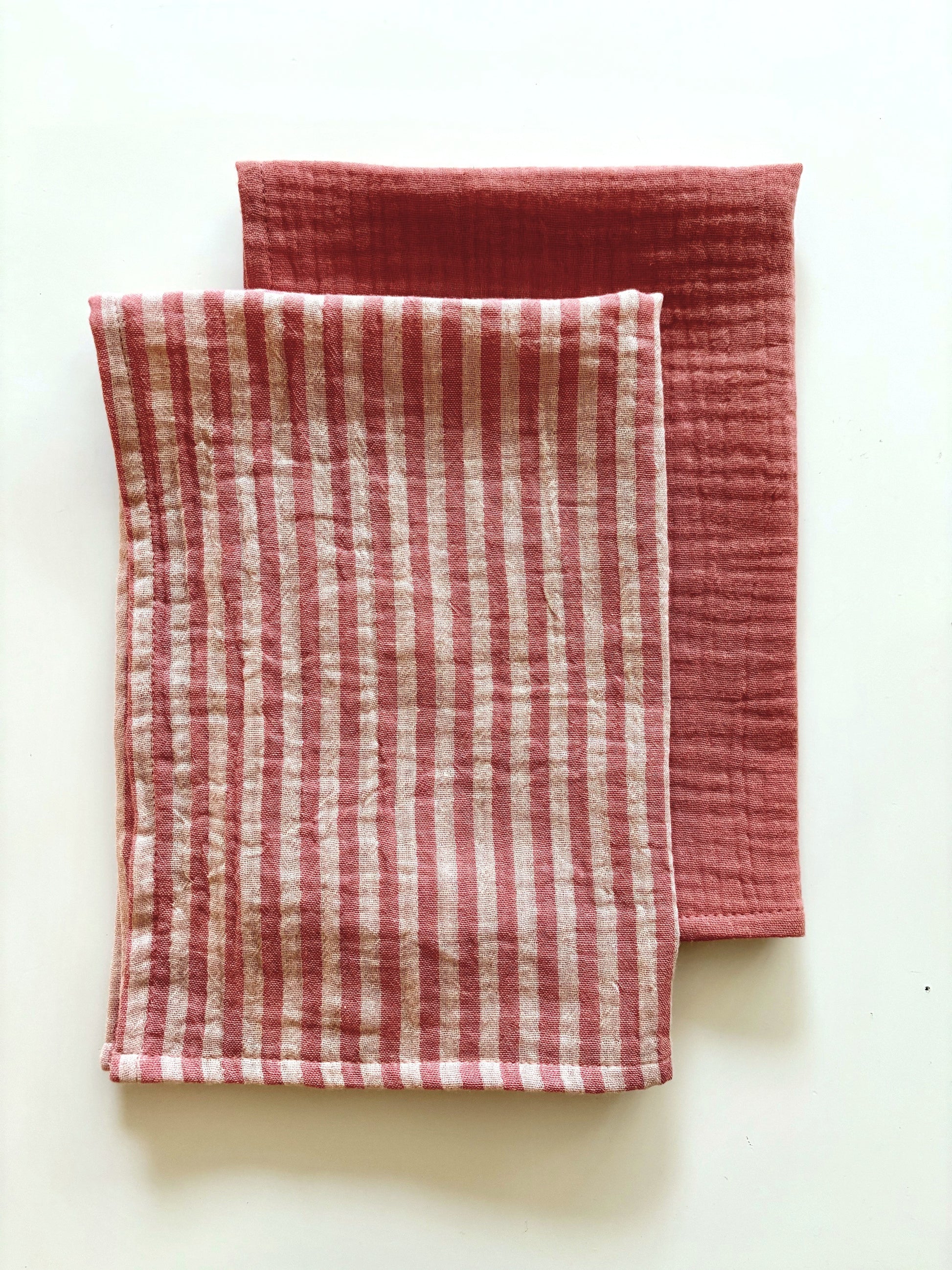 Nos essuie-mains de la collection Toscane rose poudré, rayé paprika et uni marsala