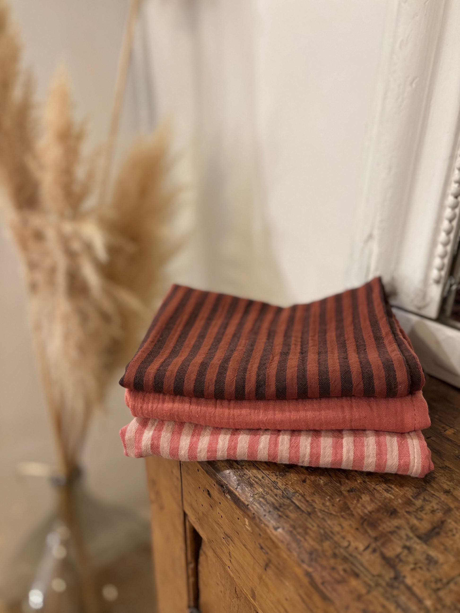 3 Essuie-mains en double gaze de coton rayé rose, toffee et uni marsala