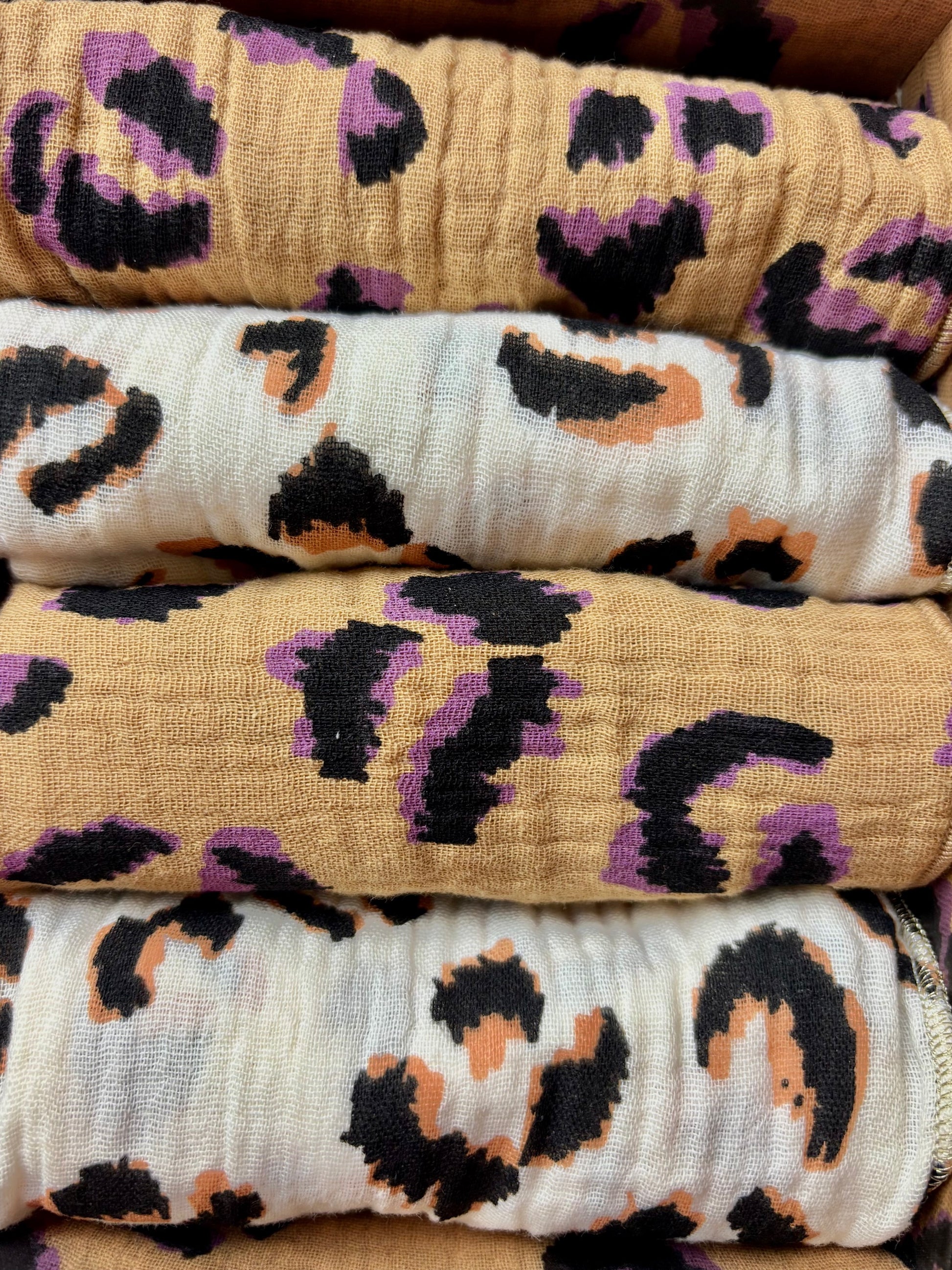 Set de 4 serviettes en gaze de coton motif léopard écru et fauve. Format 40x40 cm, finition point bourdon doré. Douces, légères et faciles à vivre : lavables en machine à 30°C, séchage rapide, pas besoin de repasser.