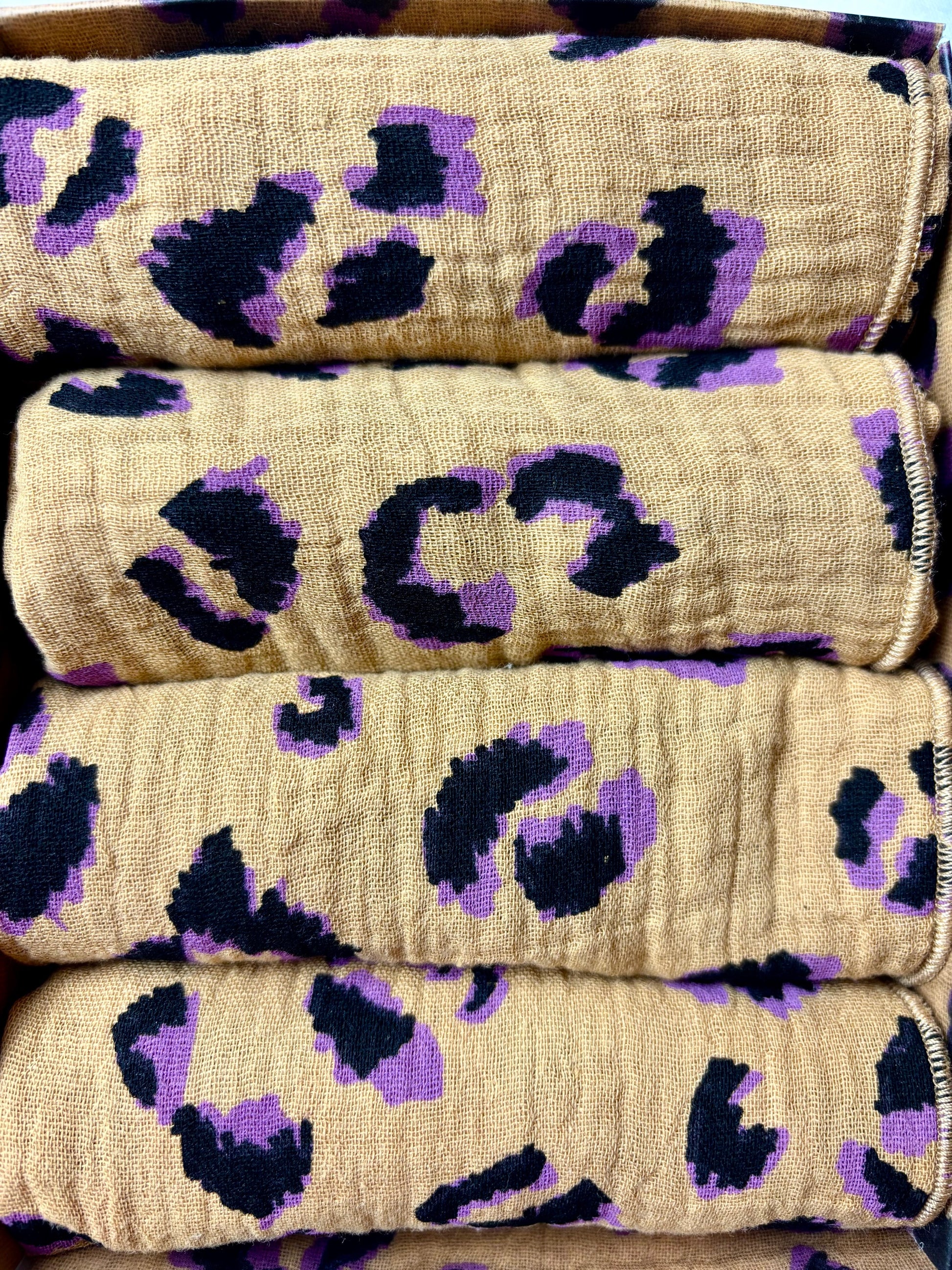 Set de 4 serviettes en gaze de coton motif léopard fauve. Format 40x40 cm, finition point bourdon ton sur ton. Douces, légères et faciles à vivre : lavables en machine à 30°C, séchage rapide, pas besoin de repasser.