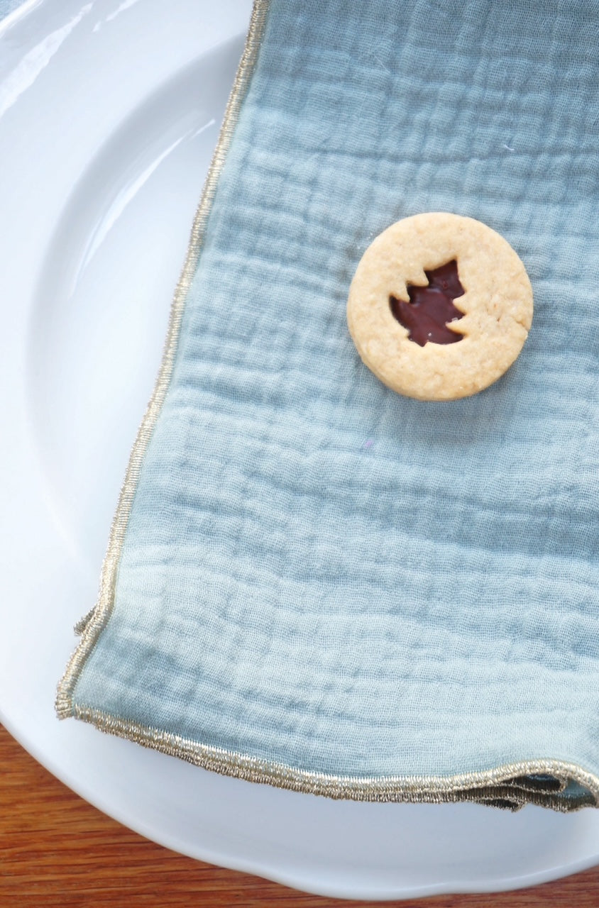 Set de 4 serviettes en double gaze de coton couleur vert de gris. Format 40x40 cm, finition point bourdon doré. Douces, légères et faciles à vivre : lavables en machine à 30°C, séchage rapide, pas besoin de repasser.