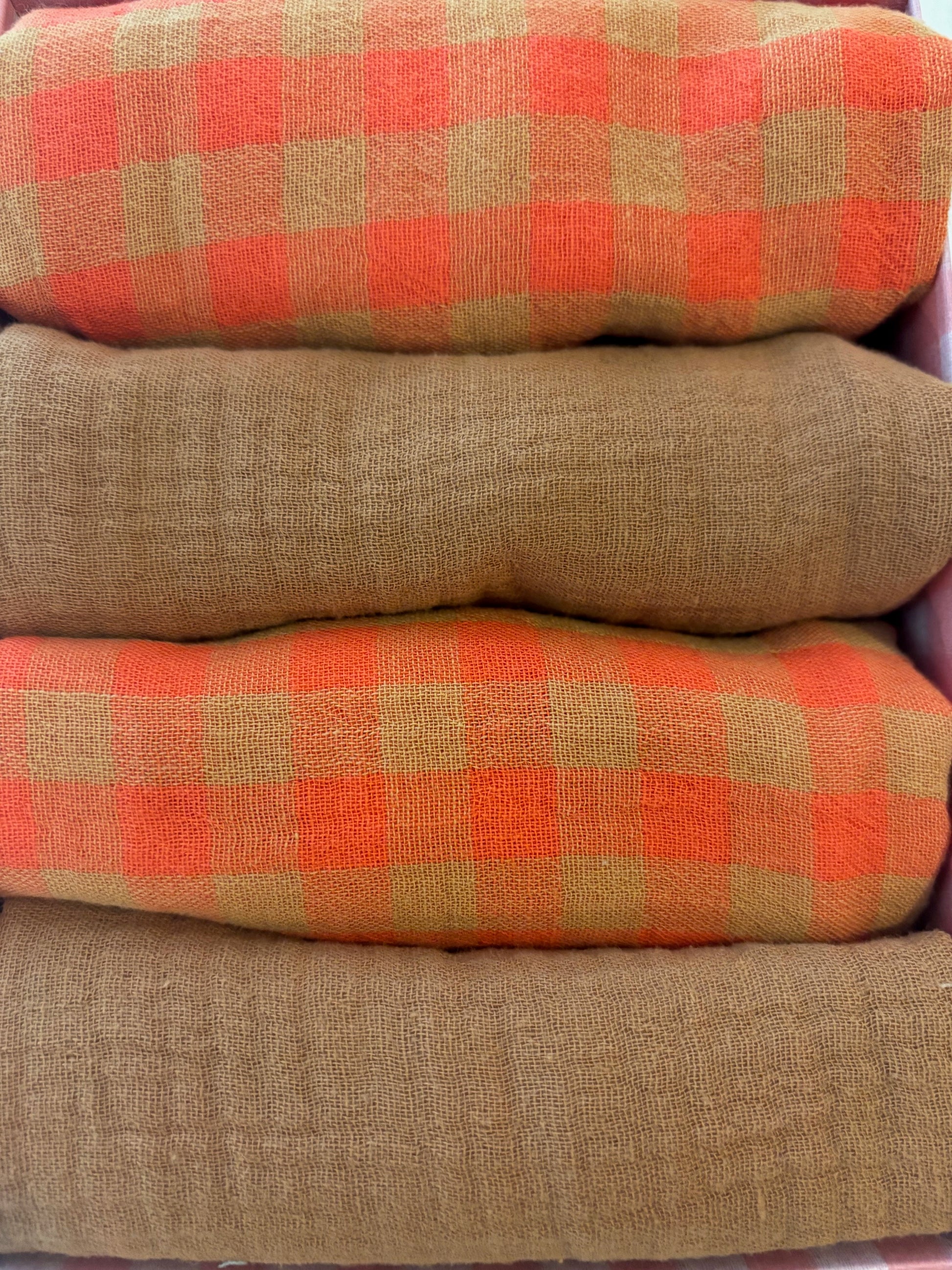 Set de 4 serviettes en double gaze de coton vichy et unie tangerine & caramel